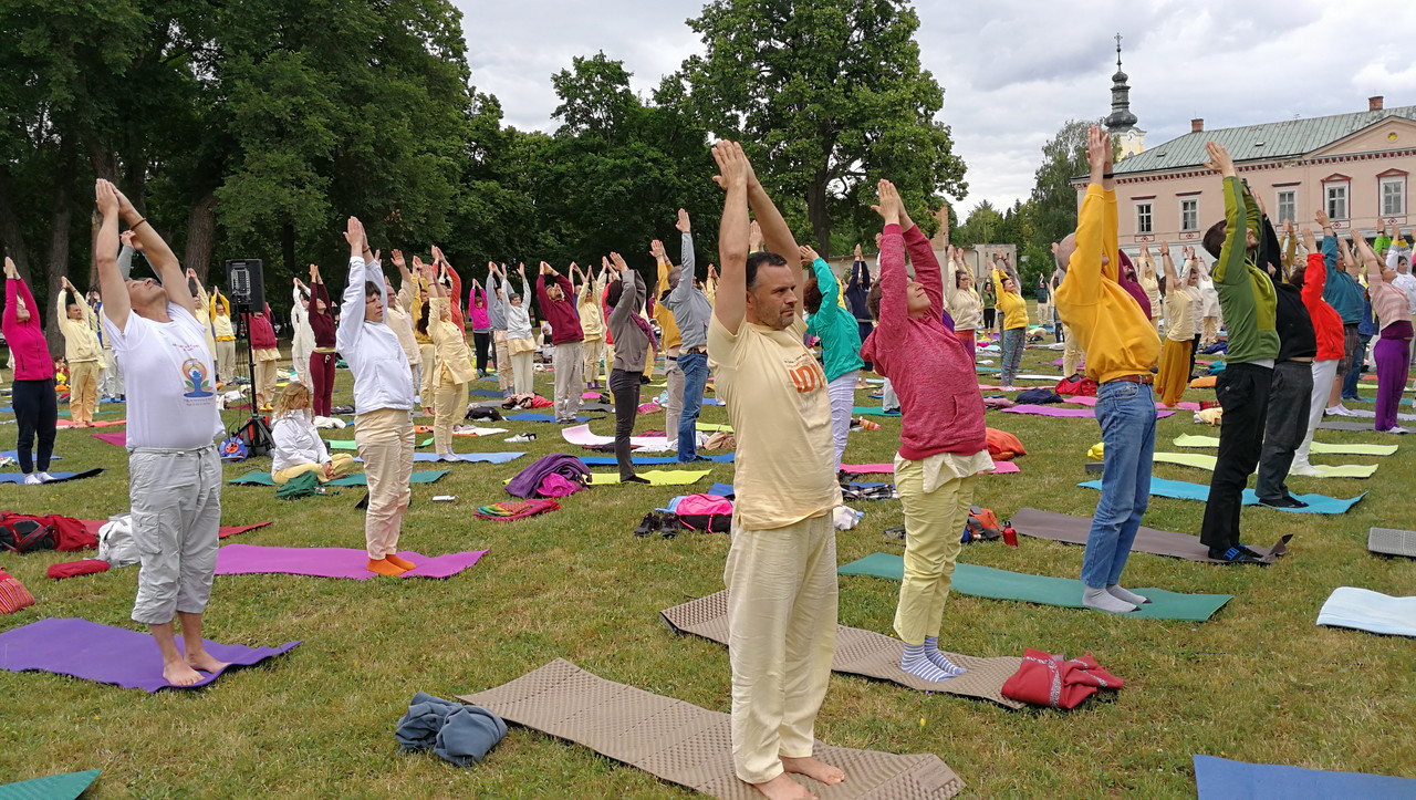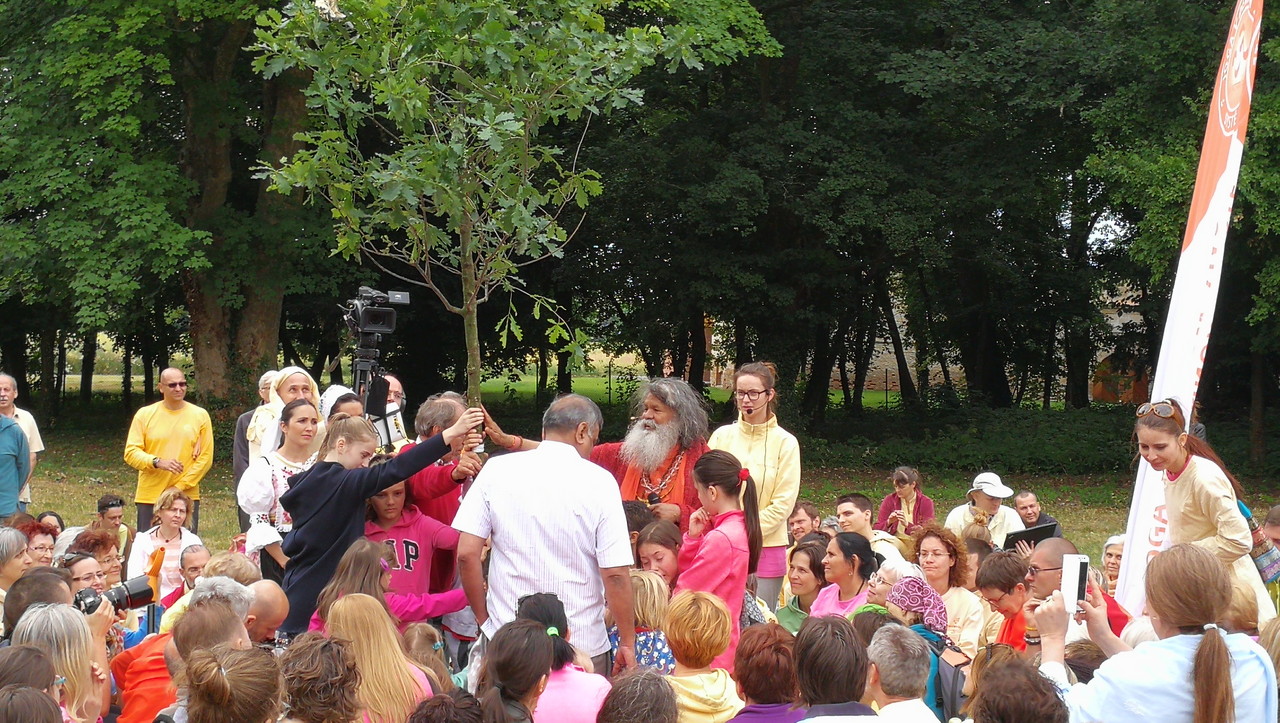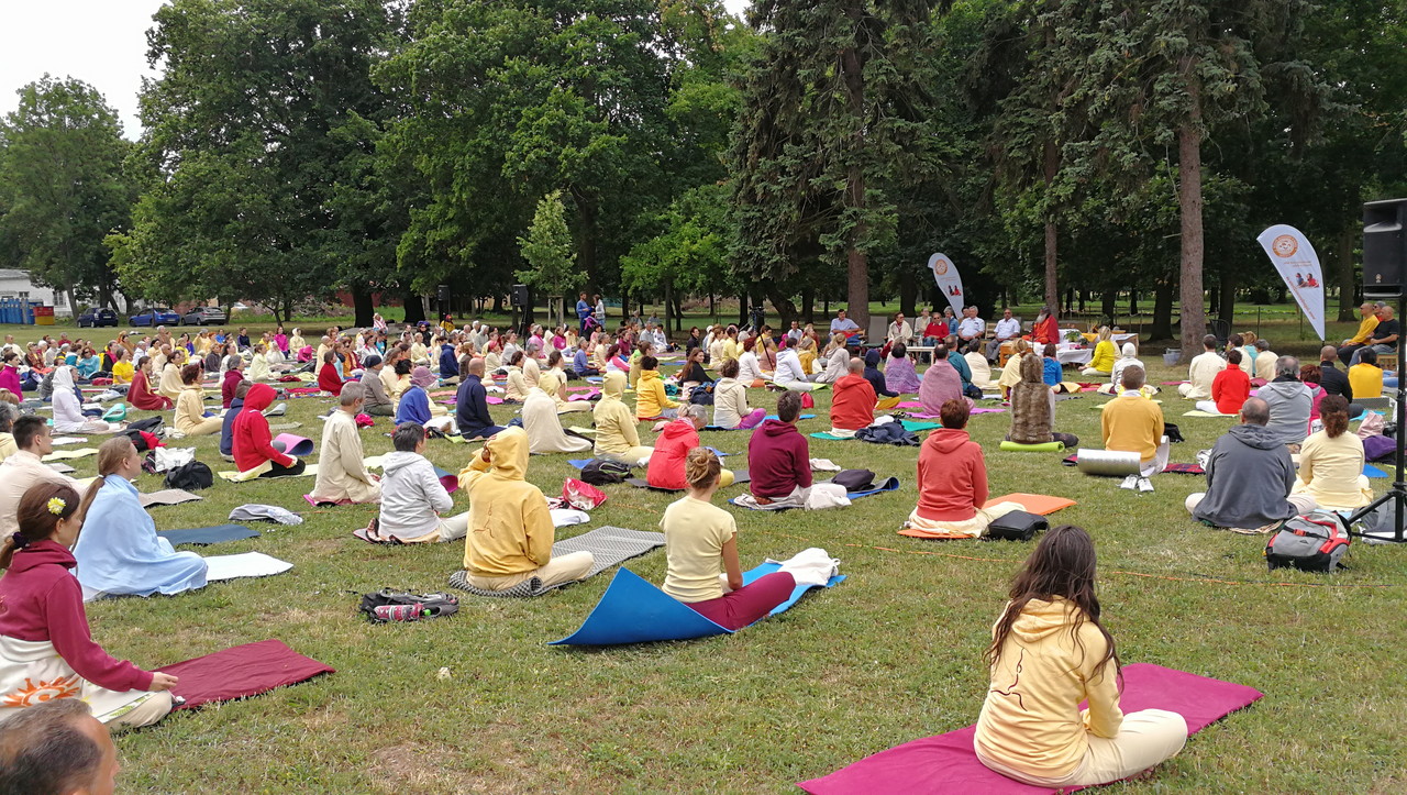 Während des Wochenend-Seminars in Bratislava besuchte Vishwaguriji am Samstagmorgen das Schloss und den Schlosspark des Dorfes Voderady, ca. 40km von Bratislava entfernt. Ein windiger, aber sonniger Tag wurde dem Internationalen Tag des Yoga gewidmet. Mehr als tausend Yogalehrer und Yogastudenten aus der Slowakei und den Nachbarländern versammelten sich, um diesen Anlass zu ehren, indem sie Khatu Pranam präsentierten und das Gayatri und Shanti Mantra sangen. Unter den Ehrengästen waren HE Shri Param Jit Mann, der Botschafter von Indien in der Slowakei und der Bürgermeister des Dorfes Voderady, der von der Legende dieses Parks erzählte, wo im Mittelalter drei durstige Mönche in diesem Park eine Quelle fanden. Vishwaguruji sprach von der Bedeutung des Internationalen Tag des Yoga für die Welt, für die Gesundheit der Menschen und für den Frieden in der Welt. Danach pflanzte Vishwaguruji zusammen mit dem Indischen Botschafter einen Friedensbaum im Park und segnete ihn mit den Worten, dass dieser Baum diejenigen, die ihn 11 mal umrunden, ihre guten und positiven Wünsche gewähren wird. Die Feier des Internationalen Tag des Yoga in der Slowakei wurde mit einem Bhandara, einem gemeinsamen Essen für alle Teilnehmer, abgeschlossen, wobei Halushki serviert wurden, eine spezielle Nationalspeise der Slowakei.