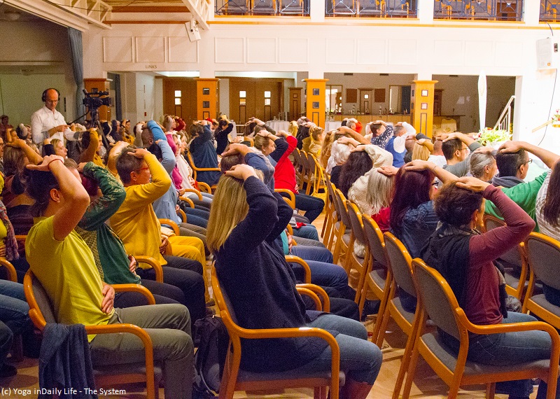 "Viele denken, Yoga praktizieren bedeutet Kopfstand oder andere Akrobatik. Das ist nicht richtig. Yoga ist grundsätzlich für ein gesundes, langes und harmonisches Leben und bietet Übungen für jeden Menschen, ob jung oder alt, gesund oder krank." Dies demonstrierte Vishwaguruji gleich in der Praxis durch einige einfache und wirkungsvolle Übungen, die auch im Sessel sitzend ausgeführt werden können: Sarva Hitta Asansas - Übungen, die für alle gut sind, sowie Basis Yoga-Atemübungen zur Harmonisierung der Nerven und Stressabbau. Zuletzt gab Vishwaguruji ein Beispiel für "das Beste im Yoga": eine kurze Meditation gefolgt von OM Singen.