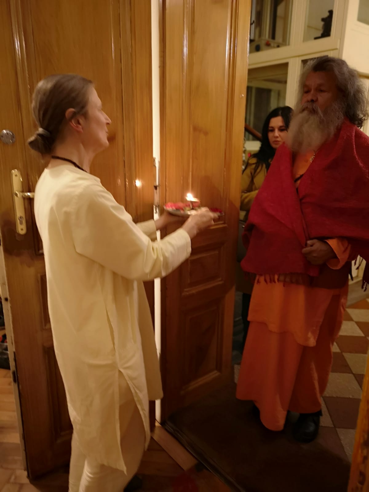 Beim Eintritt ins Yogazentrum wurde Vishwaguruji von Annapurna Erna Buchinger und den Yogaschülern mit einer Willkommenszermonie begrüßt: mit Brot und Salz sowie mit einer Puja mit Sanskrit Mantra, mit Tilak und einer Blumenmala.