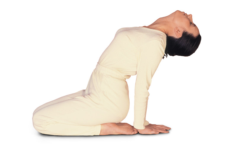 Setze dich in Vajrasana. Knie und Fersen sind etwas auseinander; die großen Zehen berühren einander. Stütze die Hände hinter dem Körper auf dem Boden ab und lehne den Oberkörper etwas zurück. Laß den Kopf locker nach hinten hängen. > Entspanne dich und atme durch die Nase tief ein und aus. Verweile in dieser Stellung ca. 1/2 Minute. Komme dann wieder in die Ausgangsposition zurück.