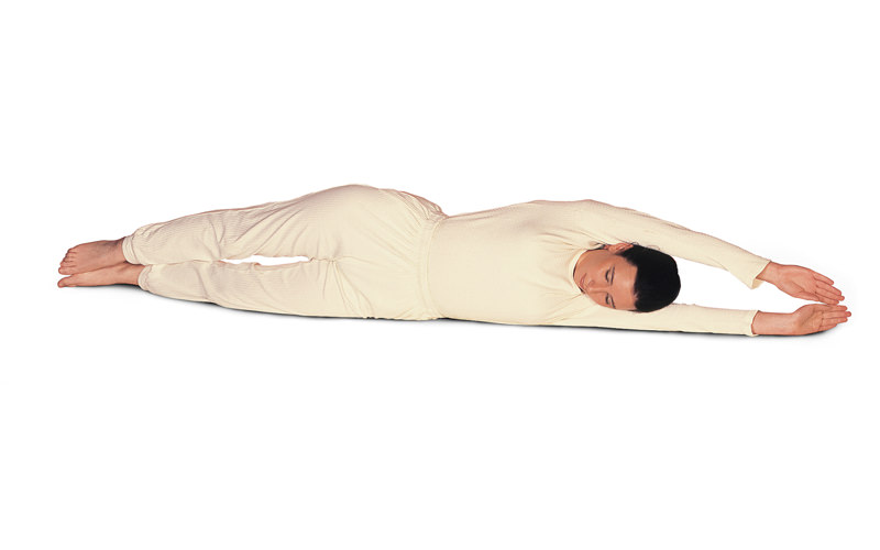 Du liegst entspannt auf dem Rücken. > Einatmend strecke die Arme über den Kopf, bis sie den Boden berühren. > Normal atmend rolle den gestreckten Körper nach links und rechts. Kehre dann in die Ausgangsposition zurück.